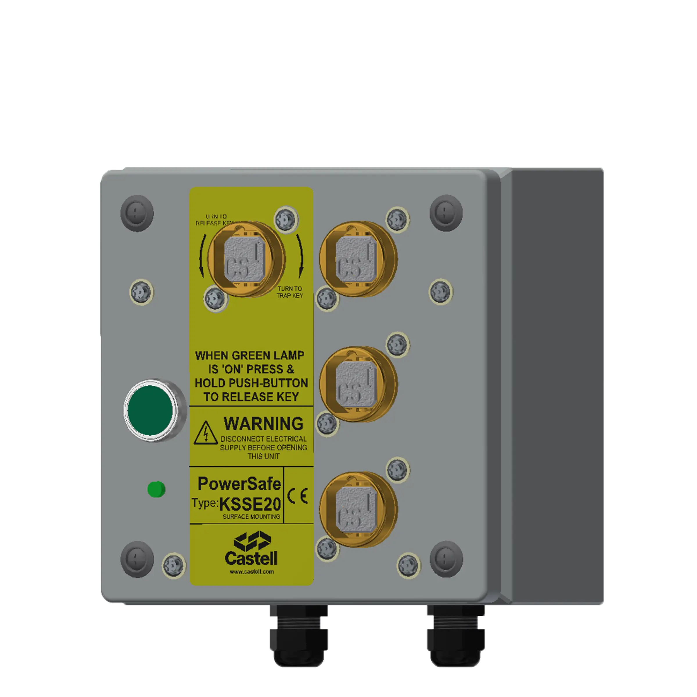 Il KSSE è un interruttore controllato da solenoide, a chiavi multiple, adatto all’isolamento di bassa tensione. Il KSSE è utile per controllare l’alimentazione di un macchinario, ad esempio quando un robot deve completare un ciclo prima che si possa togliere corrente, e quando si è in presenza di più punti d’accesso all’area protetta. Il solenoide è a funzionamento continuo e la sua posizione è monitorata elettricamente. Questo tipo di interruttore dovrebbe essere utilizzato per interruzioni di corrente brevi e off-load. Il KSSE è disponibile sia nella versione da montare a pannello sia con scatola di protezione IP65, e può essere realizzato in ottone o acciaio inox.